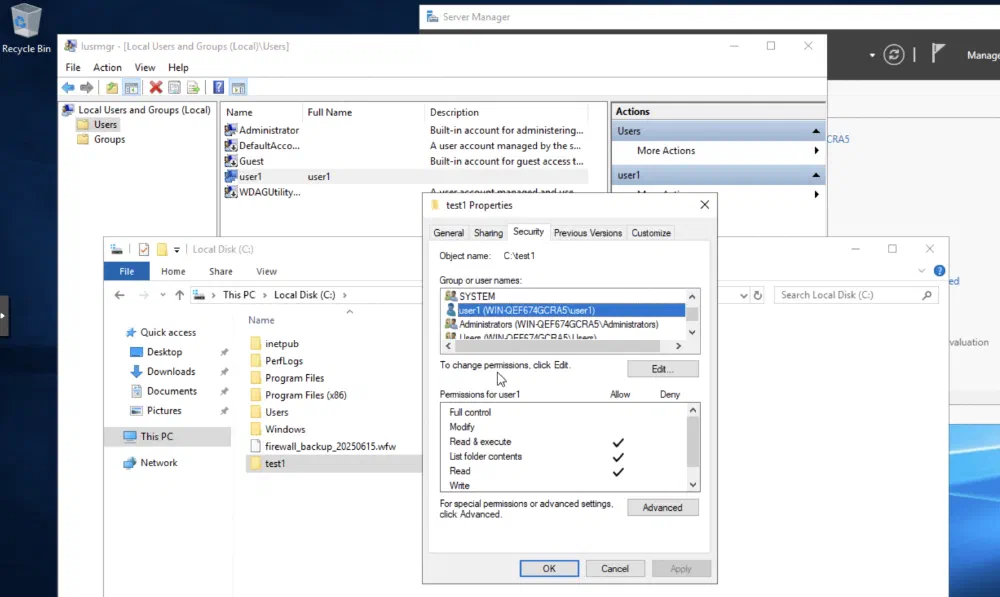윈도우에서는 어떨까요? 윈도우에서 테스트를 위해 test1이라는 이름의 폴더를 만들어서 user1 사용자가 읽을 수 있는 권한을 넣어줬습니다.